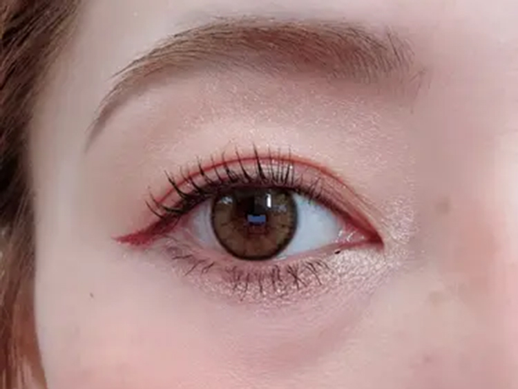 ③黒のアイラインでまつ毛の隙間を埋め、赤みのあるブラウンのアイラインを目尻に引きます。