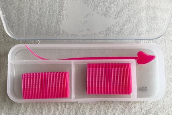 まずは付属のハートピンを使い、自然なふたえラインができる場所を探します。両端をもってひっぱると中からファイバーがでてきます。 医療用として開発された、伸縮性のある極細粘着ファイバーです。 ピンと張った状態でふたえに食い込ませたら、余分な両ハシをカットしてハートピンで端などをちょんちょんと整えます。