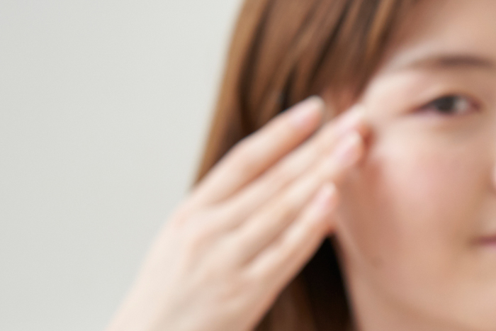 基本的にはしっとり系メイク下地を前顔に薄く伸ばして、毛穴が目立つところや脂が浮きやすいところだけ、皮脂コントロール下地を薄く重ね、ファンデーションをつけます。ベースメイクは薄くムラにならないように重ねるのもキレイをキープするポイントです。