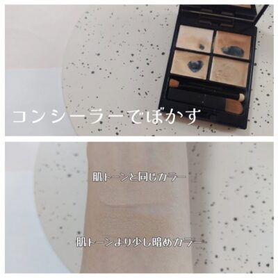 シミの部分は、カバー力の高いコンシーラーを使用します。自分の肌色よりも少し暗めの色を選ぶと、自然にカバーできますよ。ブラシや指でぼかしていきますが触り過ぎるとシミがまた顔を出してくるので、触り過ぎないように注意してくださいね。