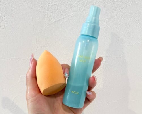 フィックスミストは、基本的にはメイクの仕上げに使用するものですが、スポンジに吹きかけてなじませることで、ベースメイクアイテムが肌により一層密着して崩れにくい層が作られるんです。