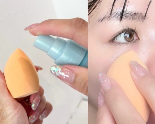 まずは化粧下地を塗り、フィックスミストを吹きかけたスポンジでなじませます。次に、リキッドタイプやクッションタイプなど肌への密着力が高いタイプのファンデーションを塗布して、再度フィックスミストを吹きかけたスポンジでなじませます。