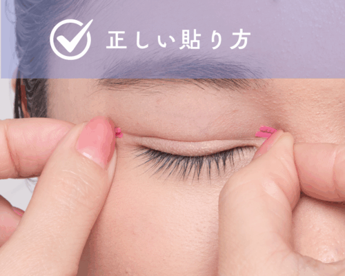 貼る位置と押さえ方がポイント。しっかり目頭から目尻まで貼り、目頭と目尻を軽く押さえて、5秒ほど待つことで肌になじませましょう。