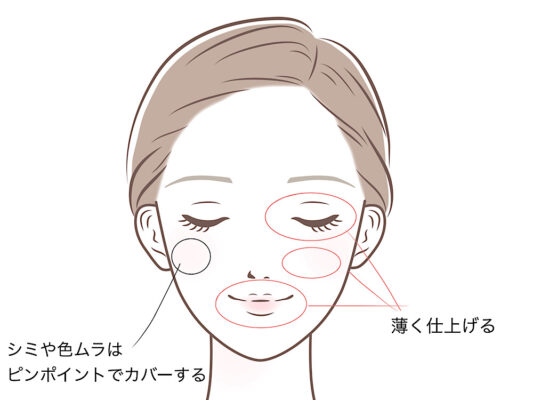 まずは顔全体を、薄く仕上げておき、本当に隠したい部分だけを、あとから重ねる使い方がおすすめ。とくに、頬の高い位置や目元まわり、口元まわりは、よく動き乾燥もしやすい場所です。ここを厚くしてしまうと、一気に「塗っている感」が出やすくなります。逆に、小さなシミや色ムラなど、ポイントになる部分だけをカバーすると、全体の印象はとても軽くなります。
