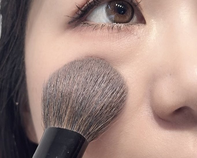 大きめのチークブラシに肌なじみがよいカラーのチークを取ります。黒目の下あたりから外側に向かって横向きの楕円を描くようにチークをいれましょう。やや広め・横長にいれることで、頬の余白が埋まっ中顔面の間延び感をカバーできます。