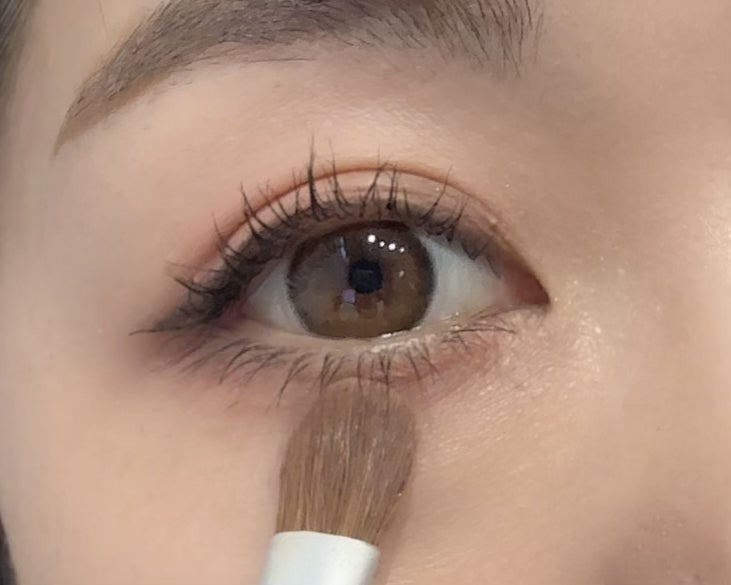 下まぶたに肌の色に近いベージュやピンク系のアイシャドウを塗り、涙袋のラインを描きます。目と頬の間を埋めるイメージで作るのがポイントです。立体感が増し、顔の余白が少なくなって中顔面短縮につながります。