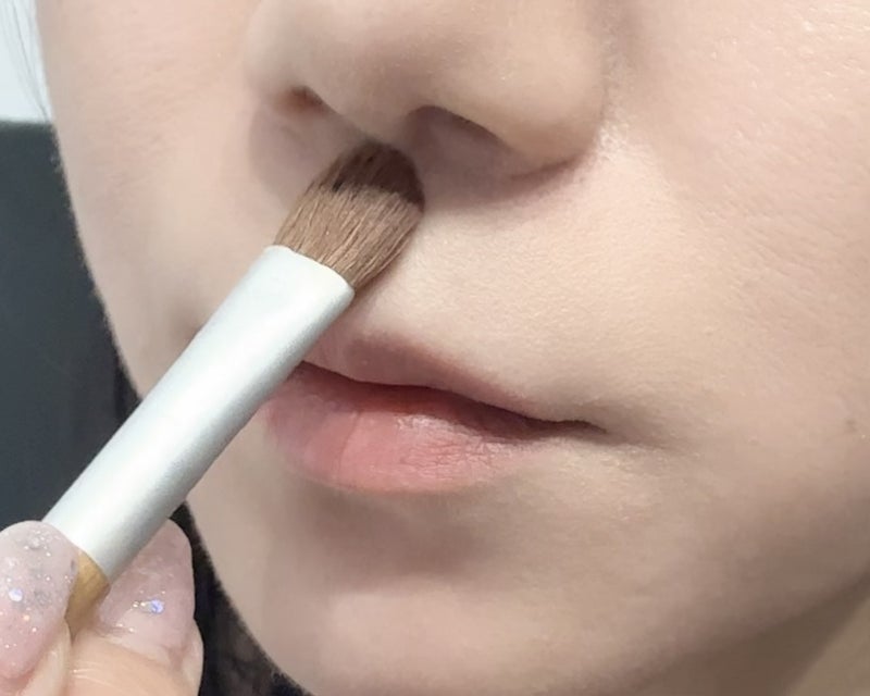 年齢と共に鼻下も間延びしやすい部分です。少しの違いですが、この部分が短く見えることで顔の印象がずいぶんと変わります。やり方はとても簡単。小さめのブラシにシェーディングをとり、鼻の下に逆三角形の影をいれます。鼻と唇の位置が近く見えますよ。