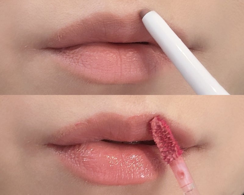 鼻下の影に加えリップでも距離を短縮させていきます。まずは、リップライナーで唇の山部分を中心にオーバーリップにするラインを引きます。しっかりと山のある唇の形をイメージしましょう。次に、ツヤ感のあるリップを塗ると唇のボリュームを演出できます。仕上げに唇の山の上に軽くハイライトをのせると立体感のある唇に仕上がって中顔面が短縮して見えますよ。