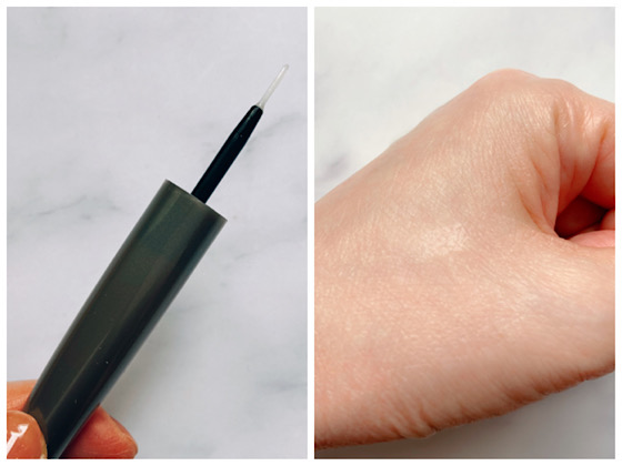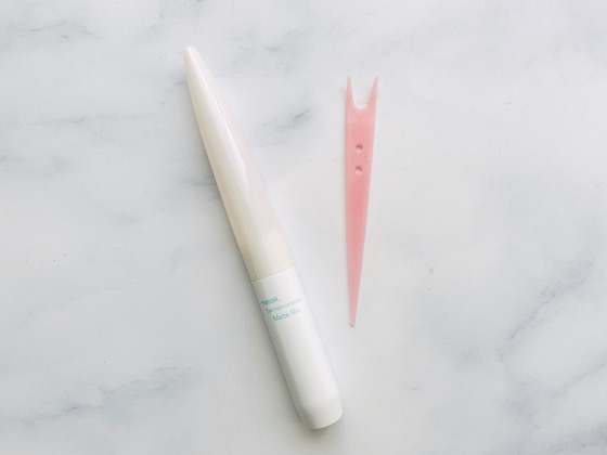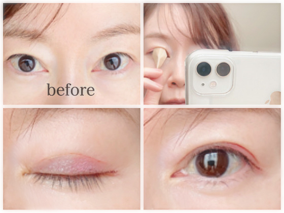 作りたい二重の位置からまつげのあたりまでフィルムを塗り、乾いたら付属のスティックでラインを押して二重ラインを整えたら完成。液は乳白色だけど、乾くと透明(しかもテカってない!)になります。