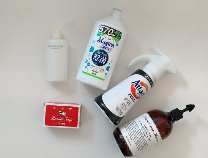 メイク道具は、中性洗剤や固形石鹸を使ってぬるま湯で洗います。使う中性洗剤は、ご家庭にあるキッチン用の食器用洗剤や洗濯用の洗濯洗剤で大丈夫。